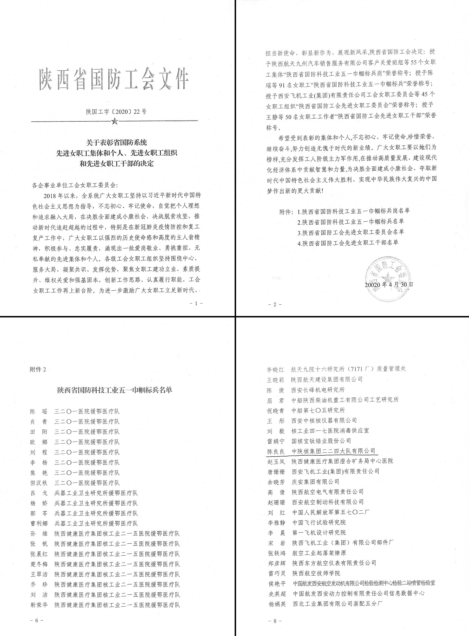 2020430日,陜西省國(guó)防工會(huì)委員會(huì)授予中陜核測(cè)繪院總工程師陳良良同志“陜西省國(guó)防科技五一巾幗標(biāo)兵”榮譽(yù)稱號(hào)。