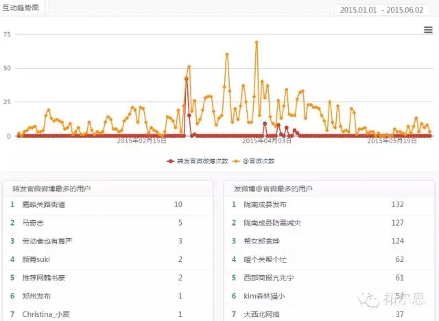對于微博、微信等自媒體數(shù)據(jù)的實施挖掘與展現(xiàn),也成為此次蘭州市大數(shù)據(jù)分析系統(tǒng)的一大特色。較為典型的如關(guān)系挖據(jù),傳播路徑挖掘,微博互動趨勢等。