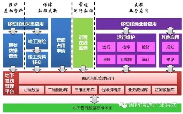 國(guó)網(wǎng)信通產(chǎn)業(yè)集團(tuán)具有對(duì)地下管線從零基礎(chǔ)到全面深化應(yīng)用的全套產(chǎn)品體系,主要包括地下管線數(shù)據(jù)采集服務(wù)與數(shù)據(jù)工廠、地下管線數(shù)據(jù)采集移動(dòng)終端應(yīng)用、地下管線基礎(chǔ)數(shù)據(jù)管理平臺(tái)、地下管線在線監(jiān)測(cè)管理系統(tǒng)與基礎(chǔ)設(shè)施提升、地下管線業(yè)務(wù)支撐系統(tǒng)與移動(dòng)作業(yè)平臺(tái),為用戶提供完整而全面的地下管線信息化管理輔助服務(wù)。