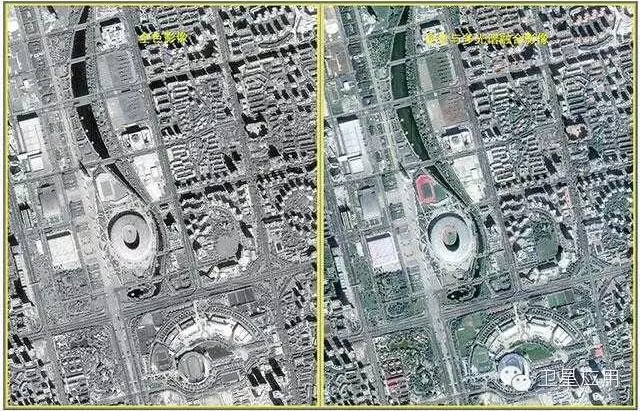 圖7 吉林一號(hào)第一幅光學(xué)影像——北京奧運(yùn)公園(左圖為全色影像,右圖為全色與多光譜融合影像)