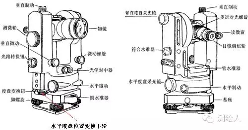 如圖,右邊是平板儀,左面是經(jīng)緯儀。平板儀其實(shí)是一個(gè)放圖紙的小桌子,經(jīng)緯儀是安置在雙向旋轉(zhuǎn)架上的望遠(yuǎn)鏡,望遠(yuǎn)鏡轉(zhuǎn)動(dòng)的角度可以從盤面上看到。