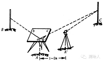如圖,平板儀和經(jīng)緯儀距離一兩米。精確測(cè)出兩者的差距和偏角,然后按照比例尺在圖上繪出經(jīng)緯儀的位置,再從圖上的經(jīng)緯儀點(diǎn)出發(fā),按照比例標(biāo)出三維數(shù)據(jù)。