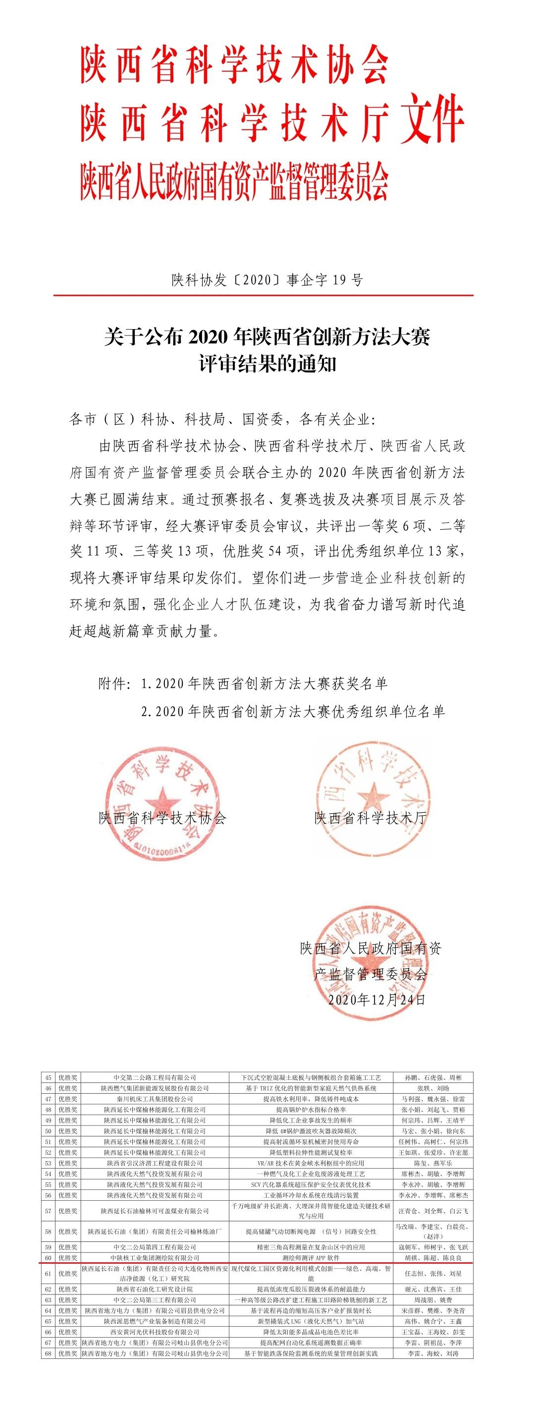 2020年12月30日陜西省國(guó)資委、陜西省科學(xué)技術(shù)協(xié)會(huì)、陜西省科學(xué)技術(shù)廳聯(lián)合舉辦的 “2020年陜西省創(chuàng)新方法大賽”勝利召開。中陜核測(cè)繪院自主研發(fā)的“注冊(cè)測(cè)繪師測(cè)評(píng)APP”軟件,通過預(yù)賽、復(fù)賽等選拔環(huán)節(jié),進(jìn)入決賽。測(cè)繪院榮獲“優(yōu)勝獎(jiǎng)”。