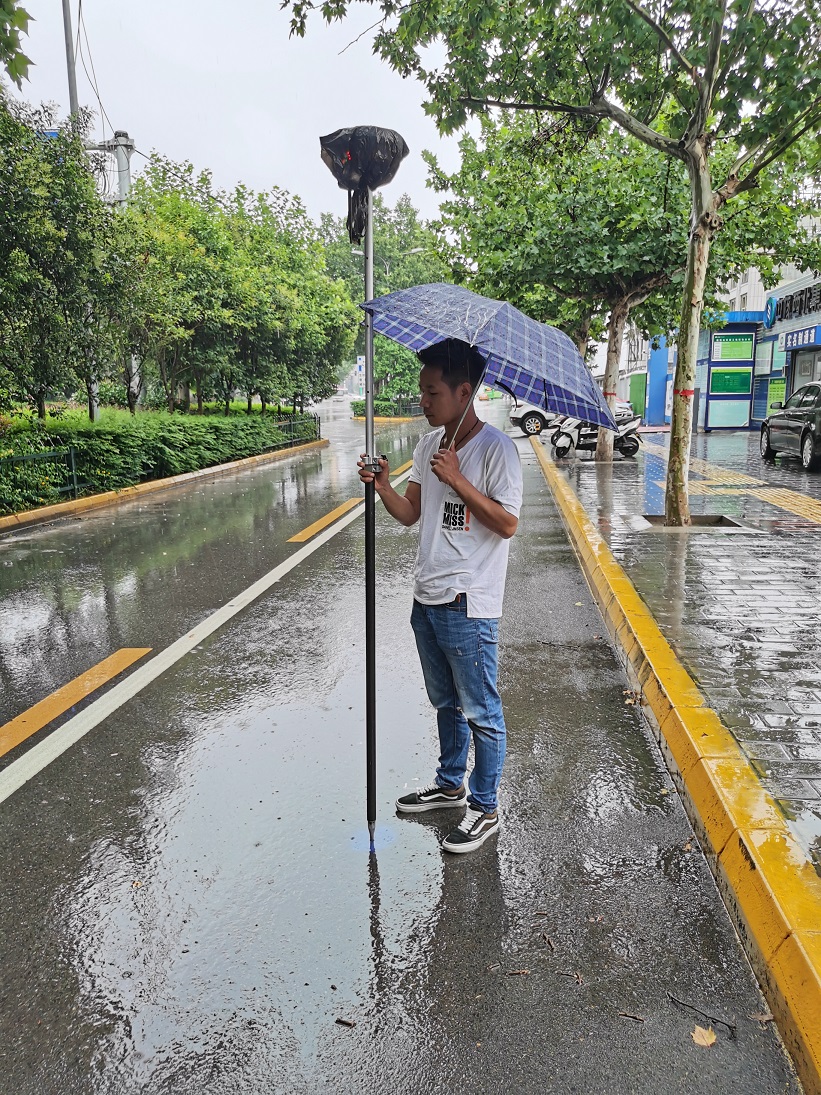 天空中飄著雨,帶著絲絲涼意。測(cè)繪院的職工依舊在陜核大廈第一線(xiàn)進(jìn)行著管線(xiàn)測(cè)量項(xiàng)目正在冒雨實(shí)施。