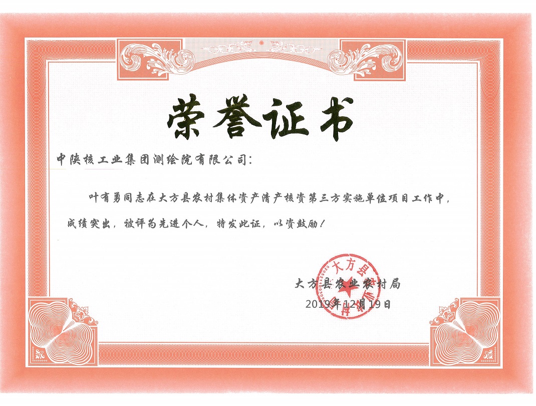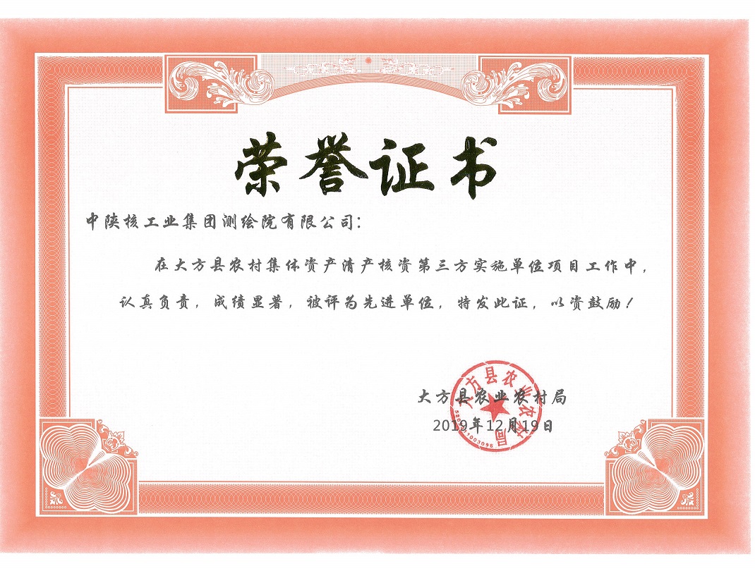 貴州省大方縣農(nóng)村集體資產(chǎn)清產(chǎn)核資項(xiàng)目是中陜核測(cè)繪院承攬的又一個(gè)跨省項(xiàng)目。該項(xiàng)目經(jīng)過中陜核測(cè)繪院大方項(xiàng)目班組全體工作人員的辛勤努力工作,2019年12月19日,被貴州省大方縣農(nóng)業(yè)農(nóng)村局授予“先進(jìn)單位”榮譽(yù)稱號(hào)。該榮譽(yù)的取得,是地方政府對(duì)中陜核測(cè)繪院工作的肯定,也是對(duì)該項(xiàng)目工作人員的鼓勵(lì),它必將進(jìn)一步增強(qiáng)該項(xiàng)目生產(chǎn)工作人員做好優(yōu)質(zhì)項(xiàng)目的信心和決心。