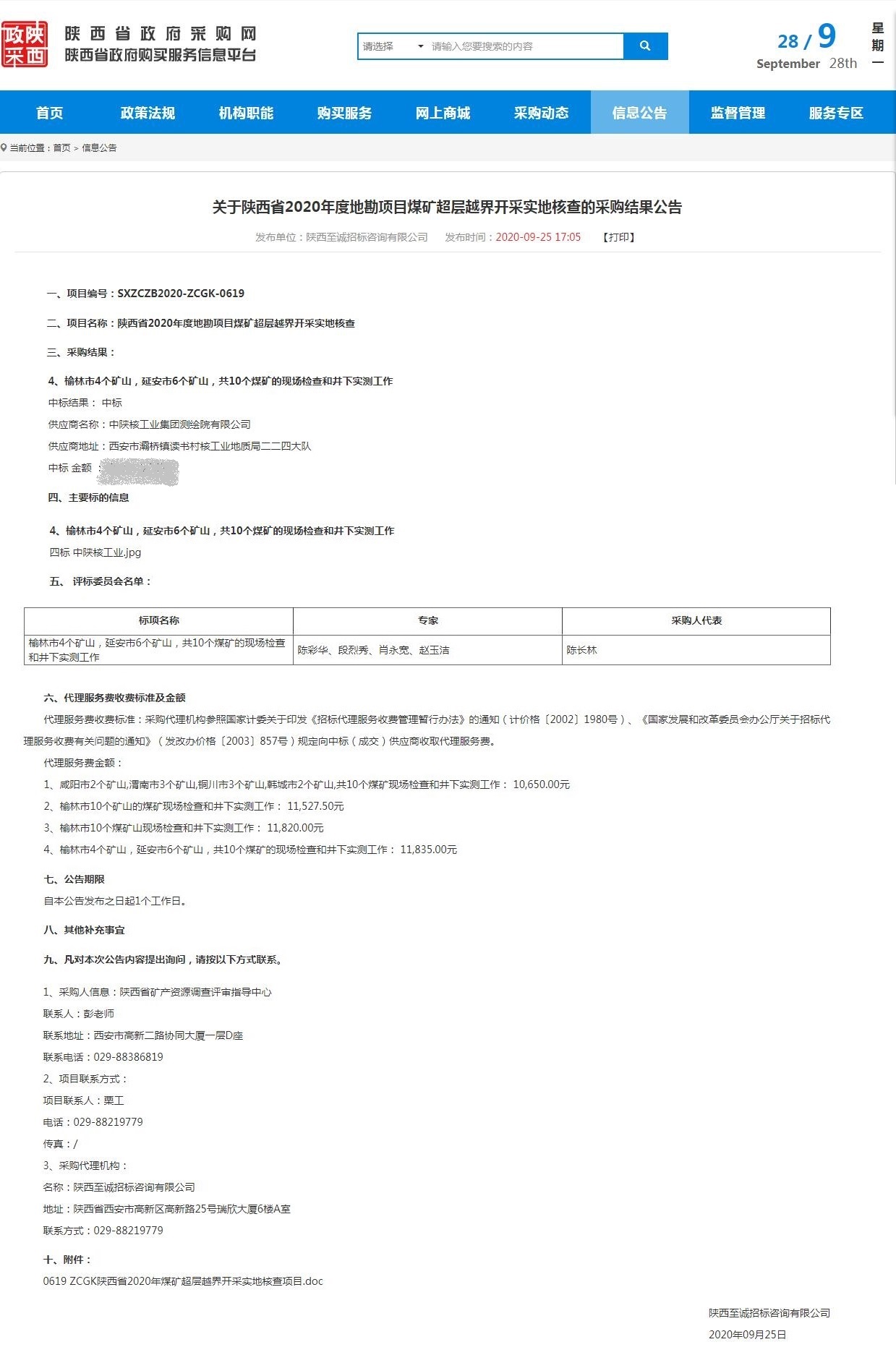 9月25日傳來喜訊!中陜核測繪院中標(biāo)陜西省2020年度地勘項目煤礦超層越界開采實地核查項目第四標(biāo)段。