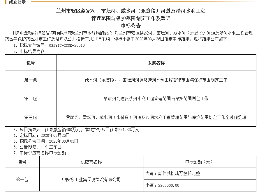 326日中陜核測繪院成功中標(biāo)“蘭州市轄區(qū)蔡家河、雷壇河、咸水河(永登段)河道及涉河水利工程管理范圍與保護(hù)范圍劃定工作第一標(biāo)段”(簡稱蘭州河湖劃界項目),合同額226.8萬元。截止今天,三個工作日公示期已滿。