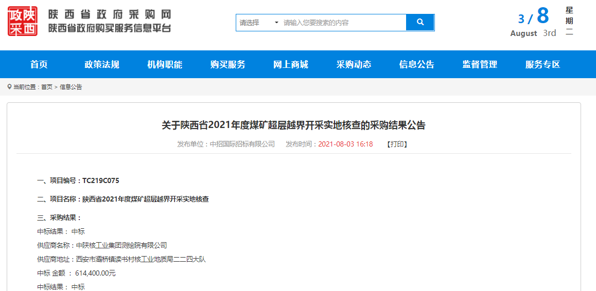 8月3日在陜西省政府采購網(wǎng)獲悉,中陜核測繪院成功中標(biāo)陜西省2021年度煤礦超層越界開采實(shí)地核查項(xiàng)目第一標(biāo)段,中標(biāo)金額為61.44萬元。